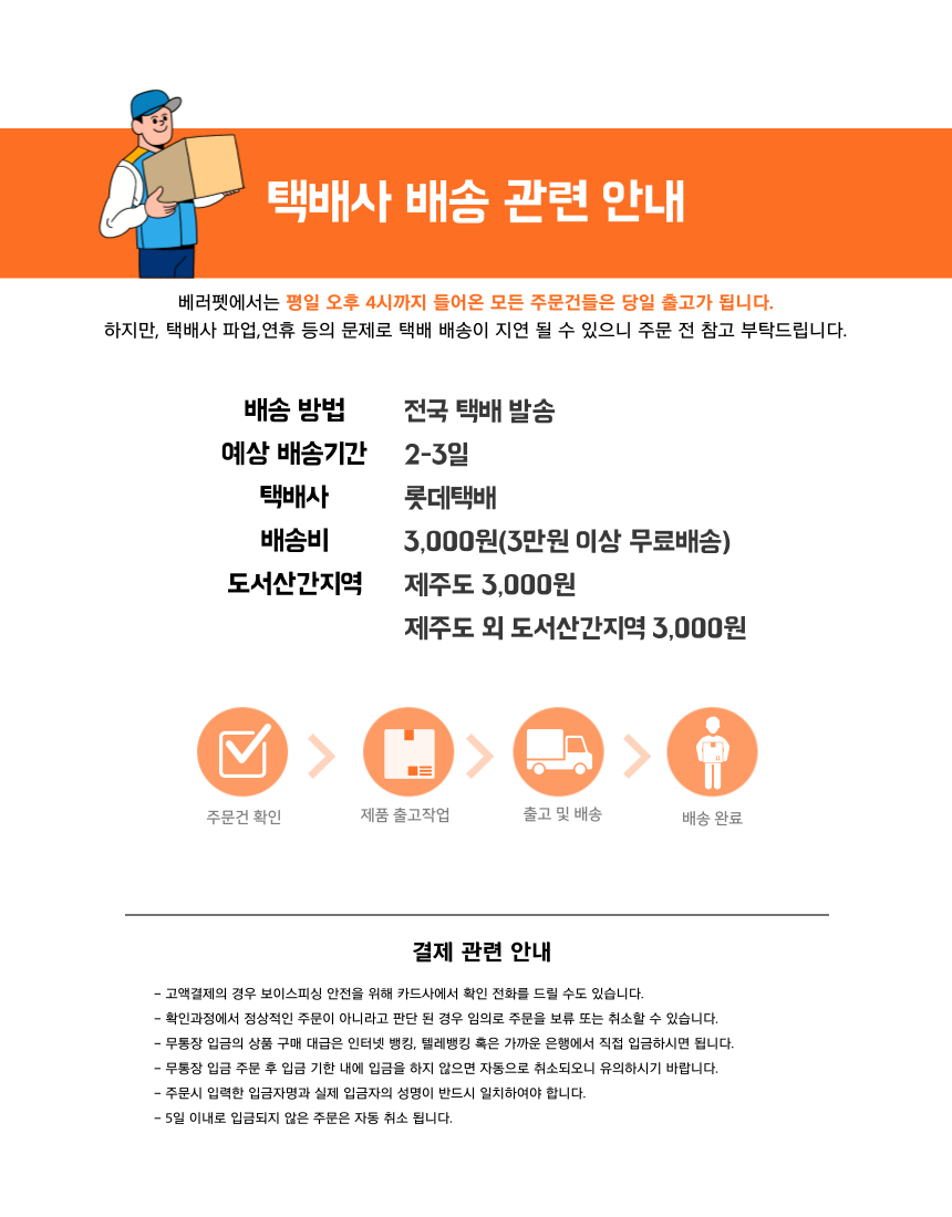 배송 방법 : 롯데 택배 / 배송 지역 : 전국 / 배송비 : 3300원(3만원 이상 무료배송 / 일부 도서 산간지역은 추가 배송비가 발생합니다)